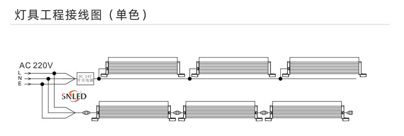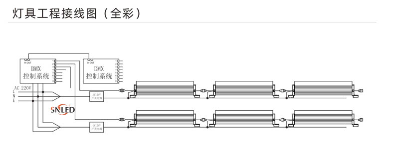 5、燈具DC24V并接不超過30/16臺,超過30/16臺請增加電源輸入線;