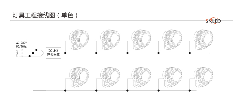 5、燈具DC24V并接不超過50/30/20/15臺,超過50/30/20/15臺請增加電源輸入線;