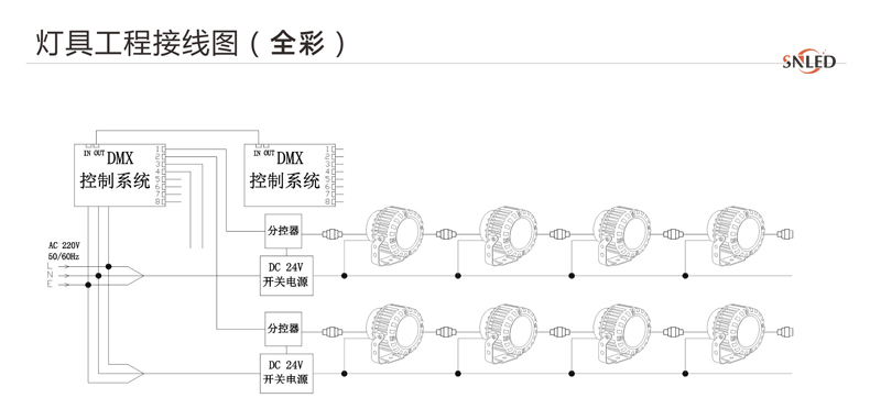 5、燈具DC24V并接不超過50/30/20/15臺,超過50/30/20/15臺請增加電源輸入線;