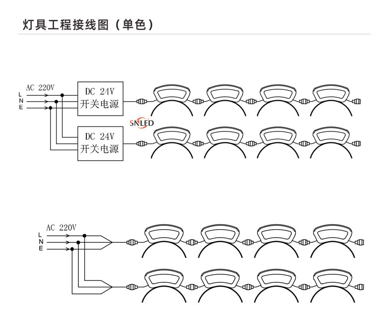 2、燈具AC220V 串接不超過20/10臺,超過20/10臺請增加電源輸入線;