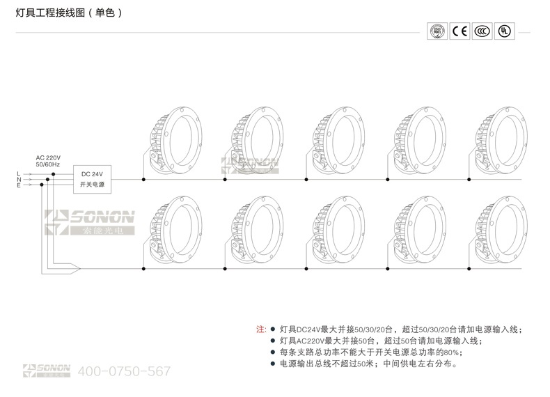 l燈具AC220V最大并接50臺(tái),超過50臺(tái)請(qǐng)加電源輸入線。