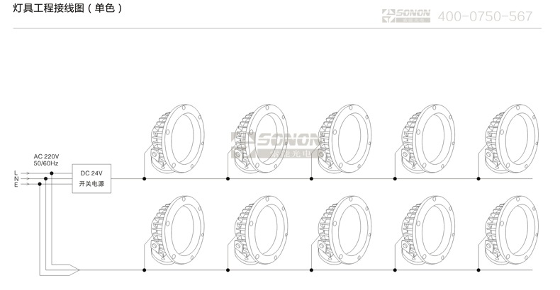 l燈具DC24V最大并接50/30/20臺(tái),超過50/30/20臺(tái)請(qǐng)加電源輸入線。