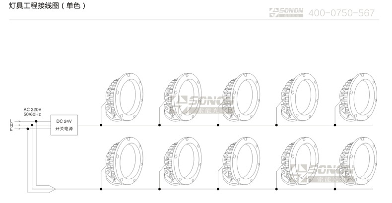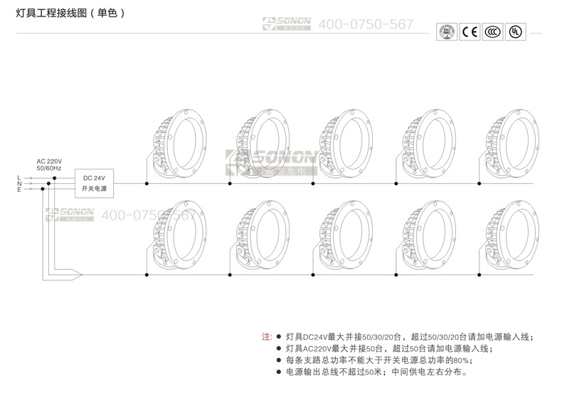 l燈具DC24V最大并接50/30/20臺,超過50/30/20臺請加電源輸入線。